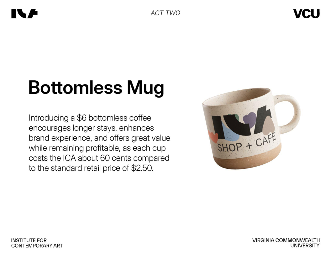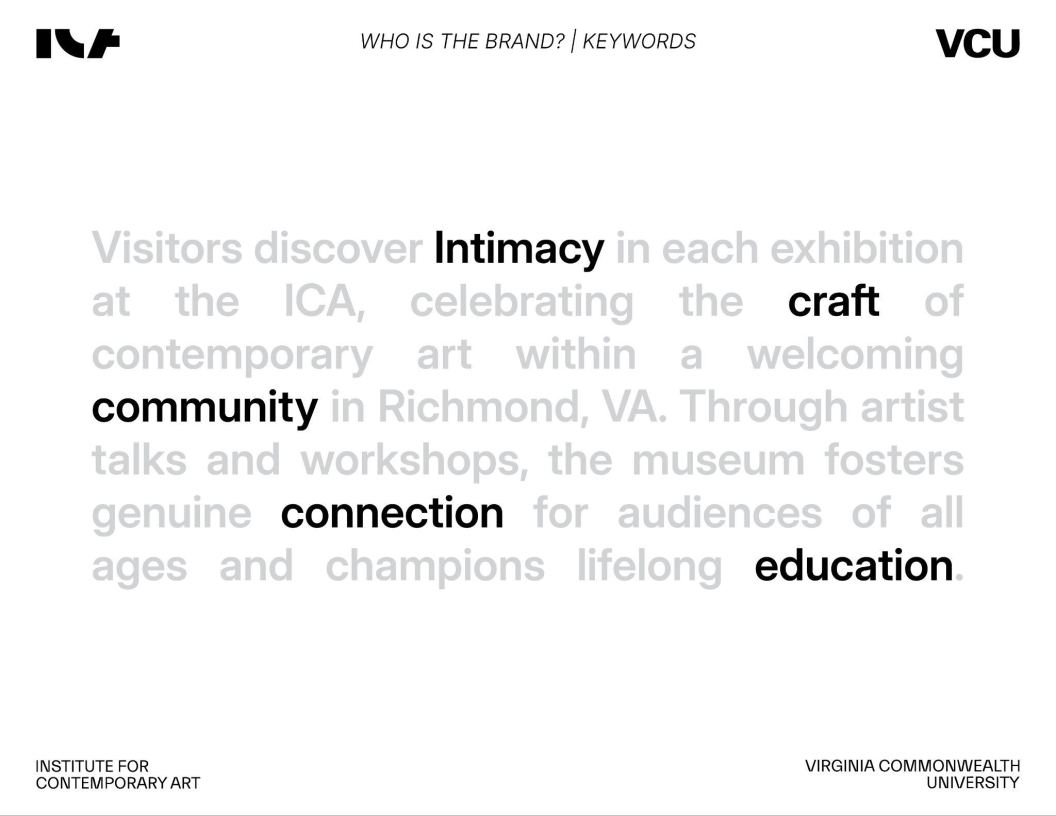 This was a collaborative group project completed with Sophie Routh, Rian Escueta, and Carter Hinds. We worked as a collective contributing our strengths in research, branding, design, and strategy. Our dynamic reflected the ICA’s own values: open communication, creativity, and thoughtful iteration.